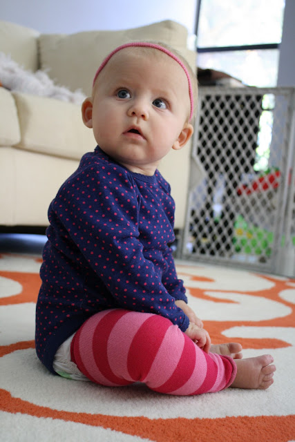 Chloe: I think you are going to start crawling any day now. You get up on all fours, rock back and forth and even move one knee forward but then realize what's the point and plop back down on your belly. I can't decide whether you are a master manipulator or just a controlling little girl. Neither of which run in the family on my side! The more we try to make you crawl the more opposed you are. You have resorted to shooting your legs out like a pencil and locking them so we can't get you into the crawl position again.